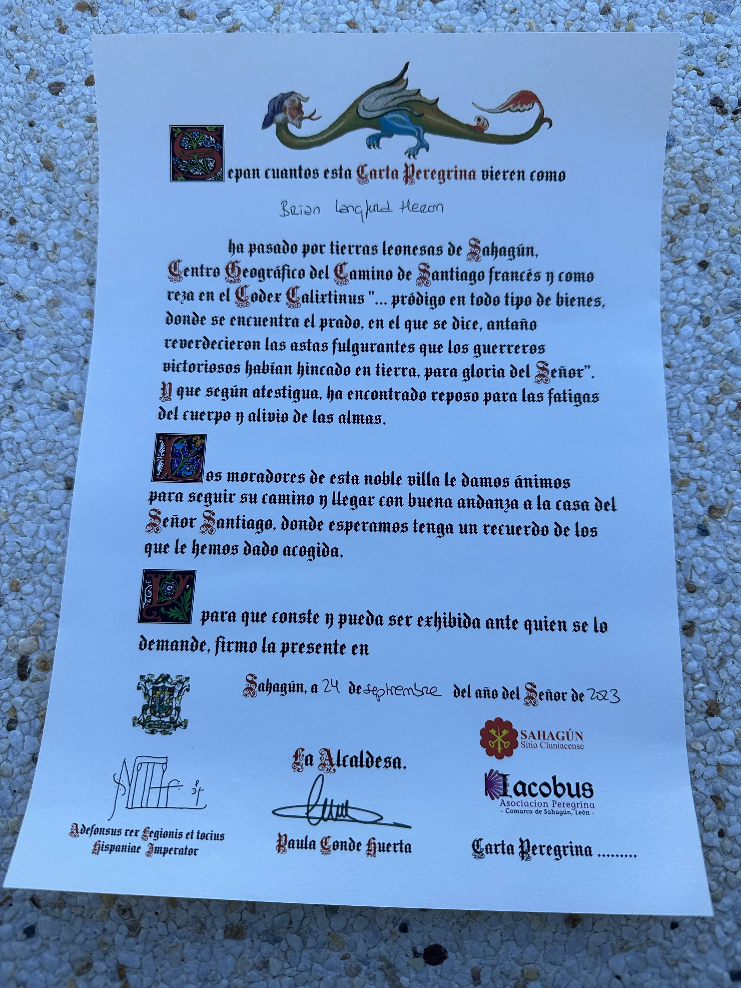 I shared a late lunch with Roger, also a Protestant minister pondering the shift from organized religion to more experience-based spirituality. Together we hiked up to the Municipal Albergue Peregrinos Cluny to receive our half-way certificate. Meeting Roger felt significant. More than one of us was out here pondering the seismic shifts taking place in our religious cultures and congregations.