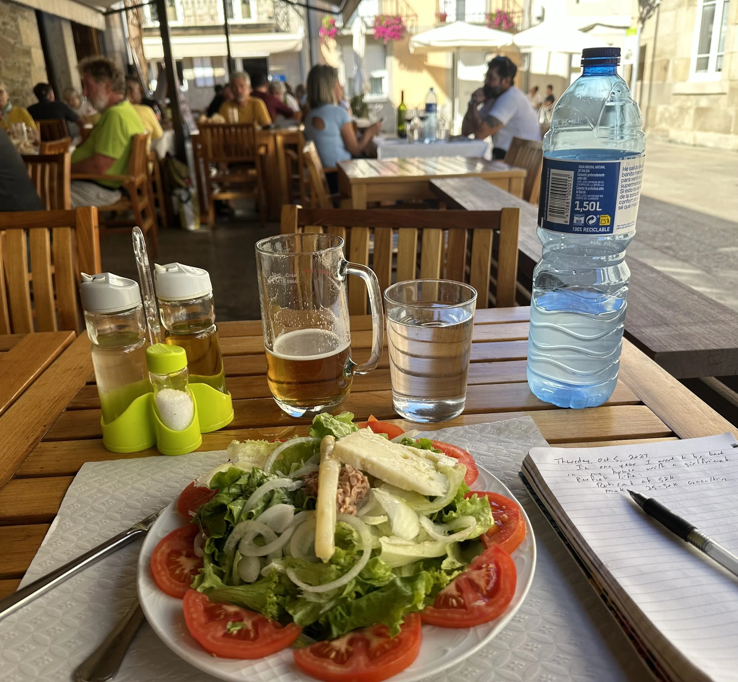 My normal post-walk meal in the afternoon—lots of vegetables, water and beer!
