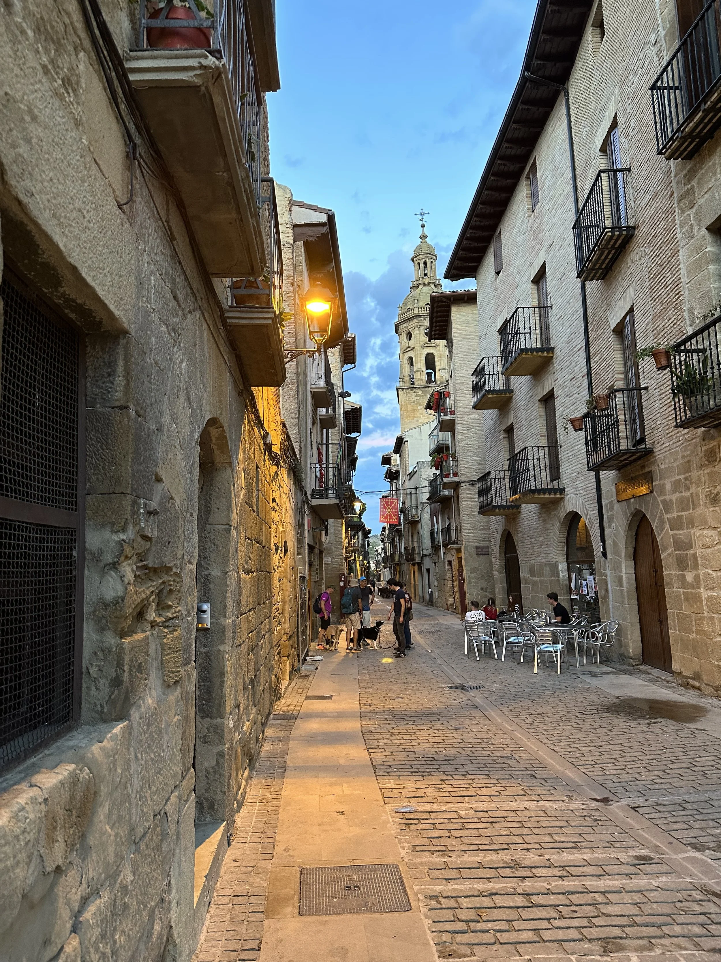 I arrived in Estella after a pretty routine day of just over 20 kilometers. I was able to get into an albergue easily, but it was one with very tight quarters. 14 beds in a room, very small bathrooms, a small wash area and no place to hang clothes to dry them. I ended up trying to dry my clothes on the ends of my bunk. The town, on the other hand, was delightful with a large courtyard where the bells of the Catholic Church rang on the hour. A number of good restaurants lined the plaza where both pilgrims and local residents intermingled while watching the children play soccer out on the plaza.